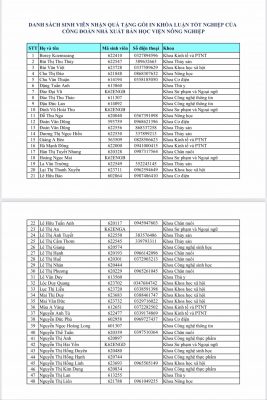 Hưởng ứng lời kêu gọi của Ban Giám đốc Học viện, Ban Chấp hành công đoàn Học viện, Công đoàn Nhà xuất bản Học viện Nông nghiệp xin gửi tặng 100 suất quà là gói in Khóa luận tốt nghiệp miễn phí cho 100 em sinh viên đang gặp gặp khó khăn do ảnh hưởng của đại dịch Covid-19 có tên trong danh sách dưới đây.